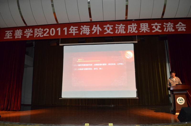 10月26日下午15:15,至善学院2011年海外交流成果交流会在我校南活报告厅隆重举行,今年暑期参加海外交流的同学们与学院同学一起分享了丰硕的海外交流成果。我院分团委书记魏珍吉、辅导员赵艺凡、路璐、瞿海琴等几位老师参加了交流会。