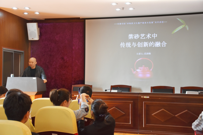 2019年4月17日下午,至善学院在图书馆819举办了一场名为“紫砂艺术中传统与创新的融合”的非物质文化遗产传承与发展讲座,特别邀请了宜兴市非物质文化遗产紫砂陶制作技艺传承人范泽锋老师为同学们介绍紫砂这门传统艺术。报告厅现场百余名同学聚精会神地聆听范老师的讲解。
