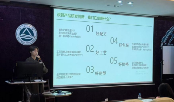 此外,“植物基海藻海鲜酱”“便携植物基拌饭酱”等往届获奖作品,均因精准捕捉消费者核心需求、具备清晰市场应用场景而展现出强劲的产业化潜力。分享环节中,获奖学姐结合“植物基冰淇淋” 研发经历叮嘱学弟学妹,应对企业命题需重点兼顾配方合规、成本可控与量产适配三大核心要素;学长则鼓励新生从日常食材入手,注重将创意转化为切实可行的落地方案。
