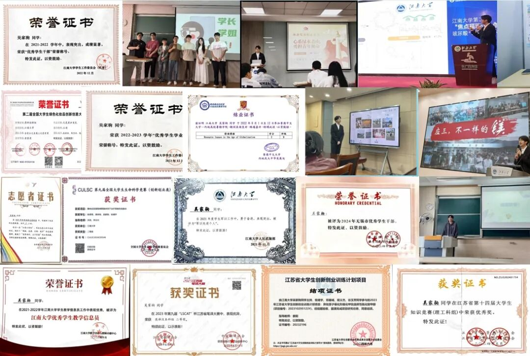 吴家驹,男,汉族,2003 年 7 月生,河北邯郸人,中共党员,化学与材料工程学院应用化学专业 21 级本科生。现任应化系学生党支部宣传委员、学院学业辅导员、班级学习委员。笃学不倦,绩点排名 2/96,累计满绩课程 44 门,曾获国家奖学金、无锡市优秀学生干部等二十余项荣誉;追求创新,获各级竞赛奖项十余项(其中国家级五项),以共同第一作者发表 1 区 top 论文一篇(IF>32,本科生历史新高),申请国家发明专利 1 项,保研至浙江大学。